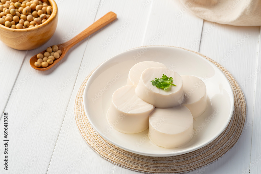 Fresh Sliced Soft Tofu soy bean curd on white plate