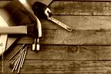 Carpentry tools on wood. Copy space