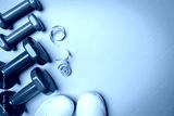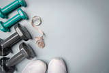 Workout flat-lay with sneakers, dumbbell, and headphones on gray background top view. Sport and fitness concept