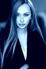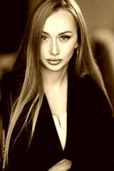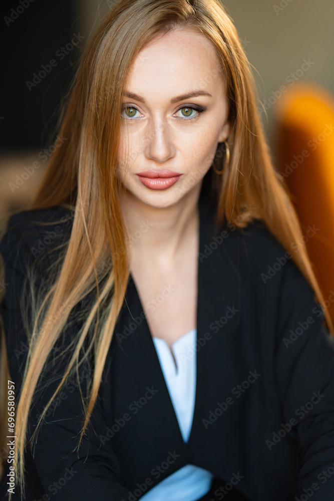 portrait of a Beautiful businesswoman with long red hair in black business suit.
