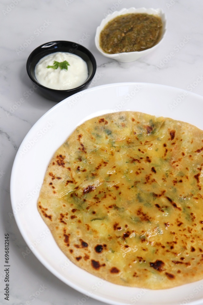 Indian Food. Aloo Paratha or Indian Potato stuffed Flatbread. Served with butter, ghee, yogurt or curd and roasted tomato chutney. over light background with copy space.
