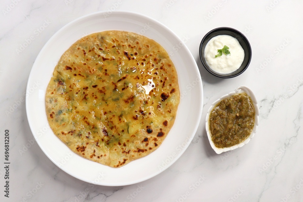 Indian Food. Aloo Paratha or Indian Potato stuffed Flatbread. Served with butter, ghee, yogurt or curd and roasted tomato chutney. over light background with copy space.