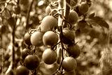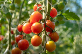 Ripe cherry tomatoes on the bush. A bed of tomatoes in the garden. Organic farming on a plot near the house.