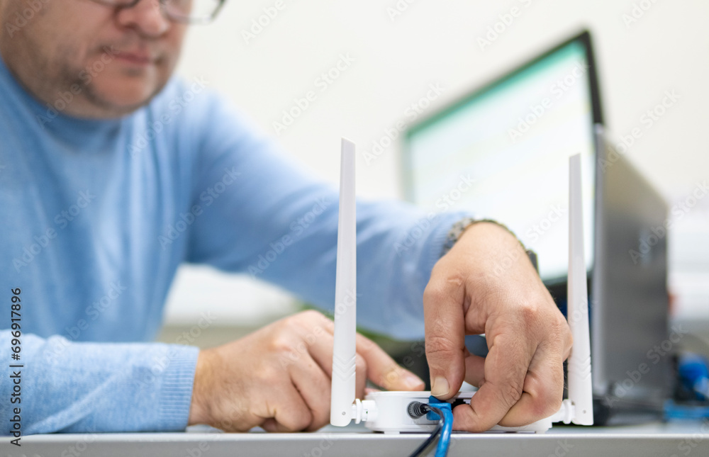 A man connects a cable to the router's Wi-Fi port while sitting at a desk in the office.
