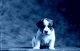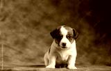 A funny little Jack Russell terrier puppy sits on his ass and looks at the camera. Lots of space for text, expressive puppy. Copy space