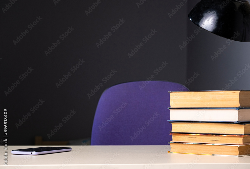A stack of books and a smartphone at different corners of the desk. The concept of learning choice. The background of a table with books and a smartphone.