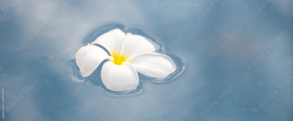 A Plumeria flower floats on the water in a pond. White tropical frangipani flower. Tropical landscape of beautiful plants and flowers. The concept of calm and tranquility.