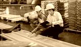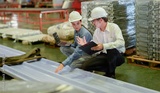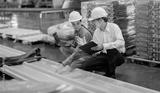 partner woman engineer assistant in helmet inspection check heavy machine construction installation in industrial metal roof roll sheet factory with colleague manager. partnership operation factory
