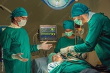 Team of surgery doctor using defibrillator pump chest heart patient to save life while medical surgery in operating room at emergency CPR. Defibrillator in surgeon specialist hand.