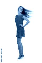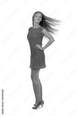 Beautiful girl in a turquoise dress with developing hair in the