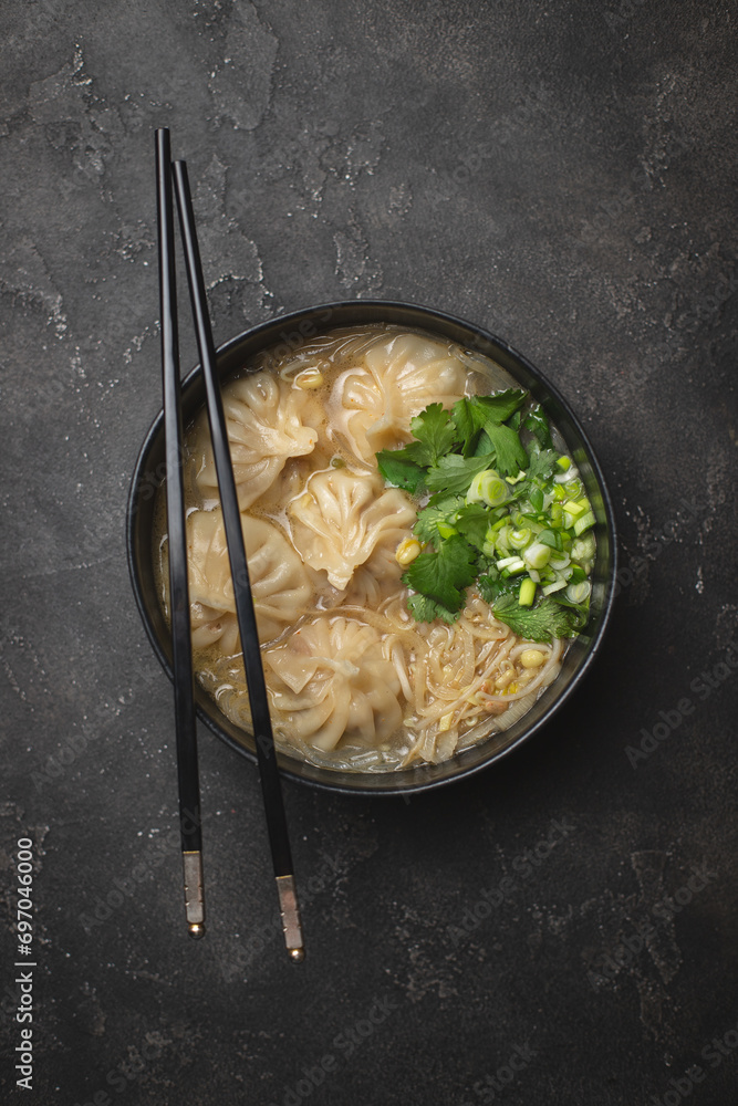 Appetizing Thai soup with gyoza, noodles and herbs.