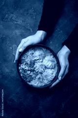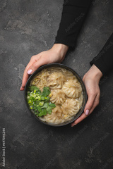 Appetizing Thai soup with gyoza, noodles and herbs.