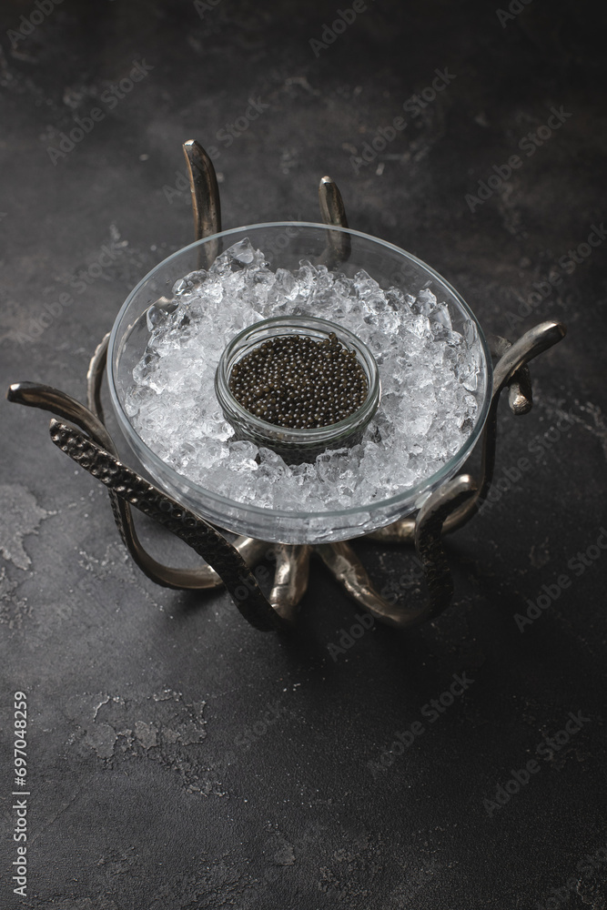 Black sturgeon caviar on a beautiful stand on a black textured background. Restaurant service. Delicacy.