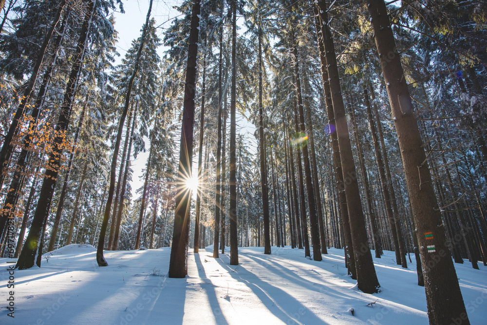 Catching a star of sun in a spruce forest covered with white glittering snow in Beskydy mountains, Czech republic. Winter morning fairy tale