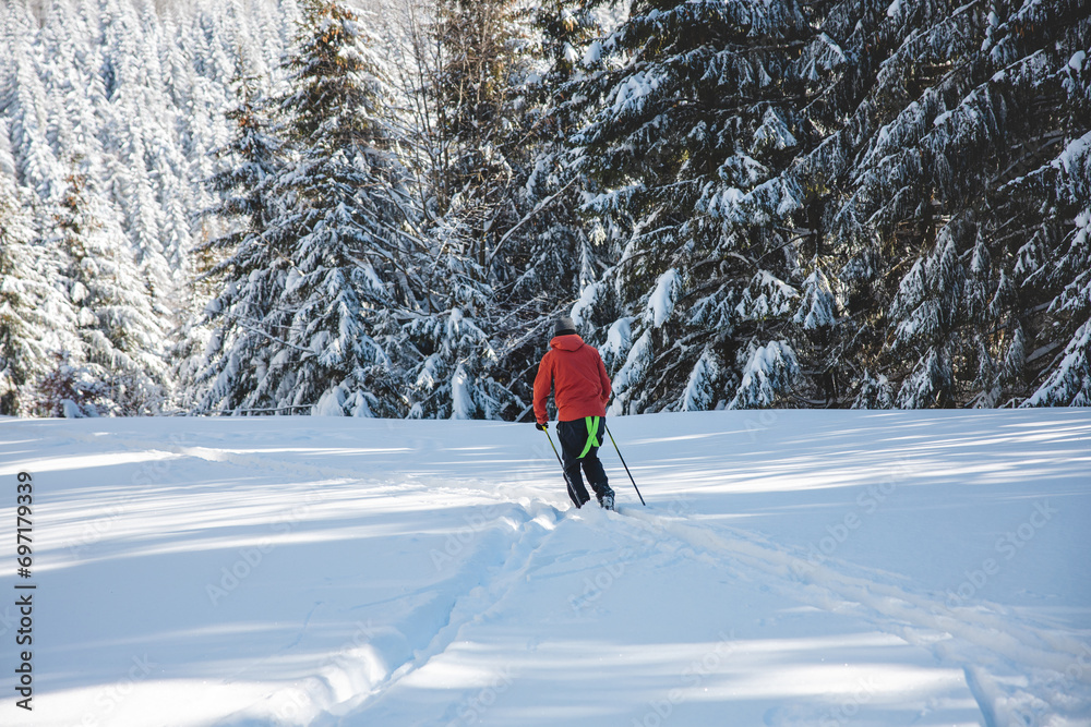 Young adult cross-country skier aged 20-25 making his own track in deep snow in the wilderness during morning sunny weather in Beskydy mountains, Czech Republic