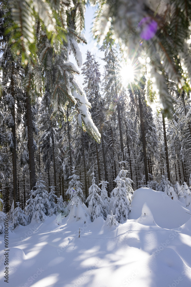 Winter scenery with sun rays reflecting off the glittering snow. Sunrise in a snowy wilderness and woodland. Beskydy mountains, Czech Republic
