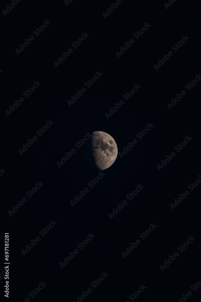 Moon in its full glory in a dark sky. Holes and depressions on an orbiting body in outer space. The white-grey moon