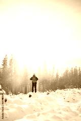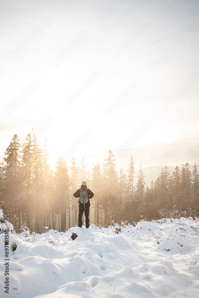 Traveller looks around the snowy landscape. Winter walk through untouched landscape in Beskydy mountains, Czech Republic. Hiking lifestyle. Sunrise at winter