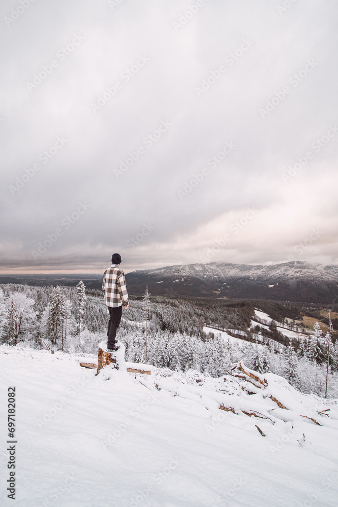 Traveller looks around the snowy landscape. Winter walk through untouched landscape in Beskydy mountains, Czech Republic. Hiking lifestyle