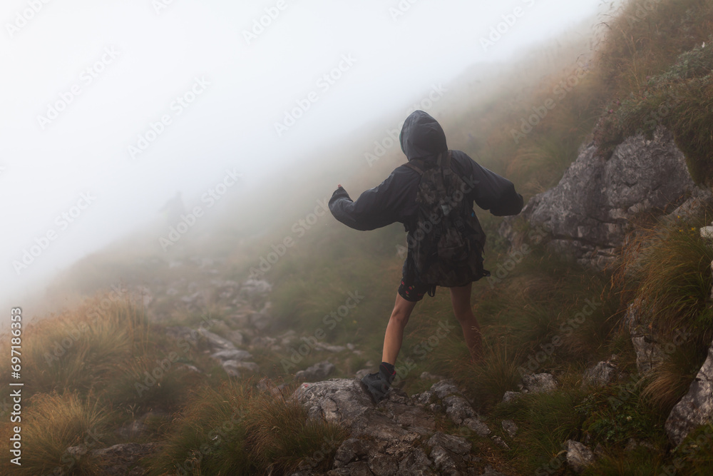 Adult Hiker Descending High Mountain Hiking Trail in Wet Weather Overcast Conditions Rear View