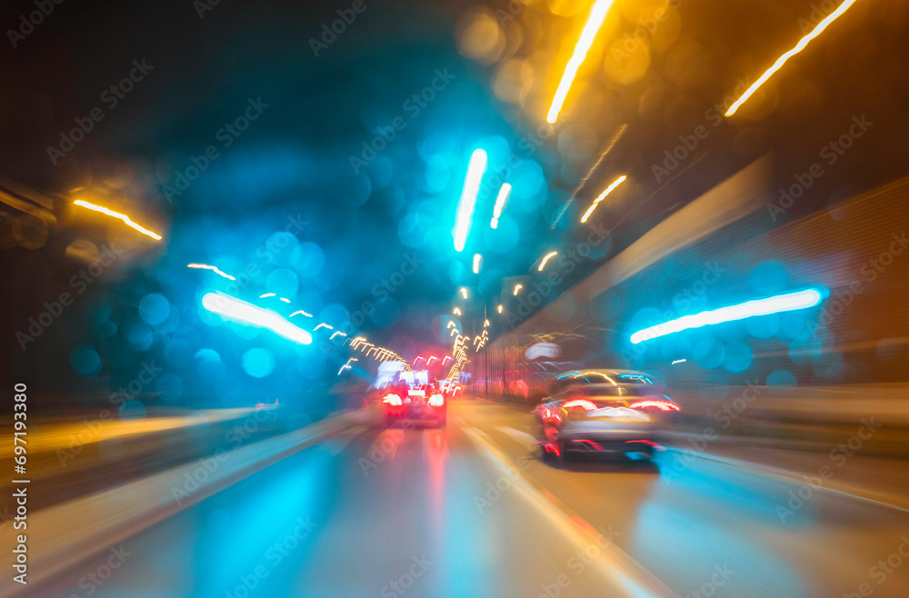 City colorful night lights perspective blurred by high speed of the car. A streak of light, trails.