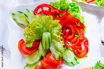 top view of fresh sliced vegetables on white plate. wedding reception.