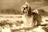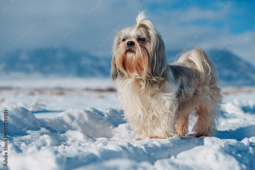 Shih tzu dog standing on mountains background in winter