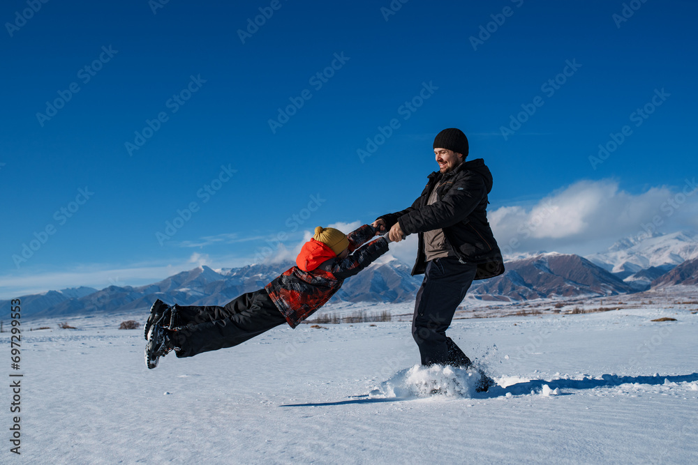 Father spins his son around on mountains background in winter