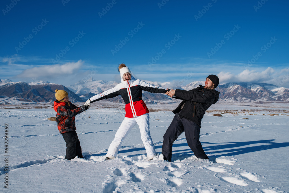 Happy family with child having fun in the mountains in winter