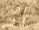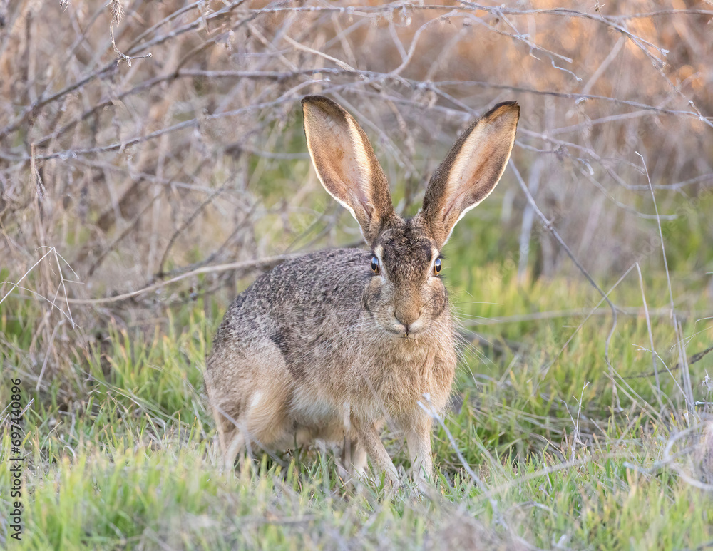 Alert Black-tailed Jackrabbit starring at the camera. Shoreline Lake and Park, Santa Clara County, California, USA.