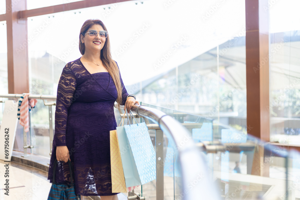 Beautiful young indian woman in shopping mall with paper bags, purchases in hands. Shopaholic concept.