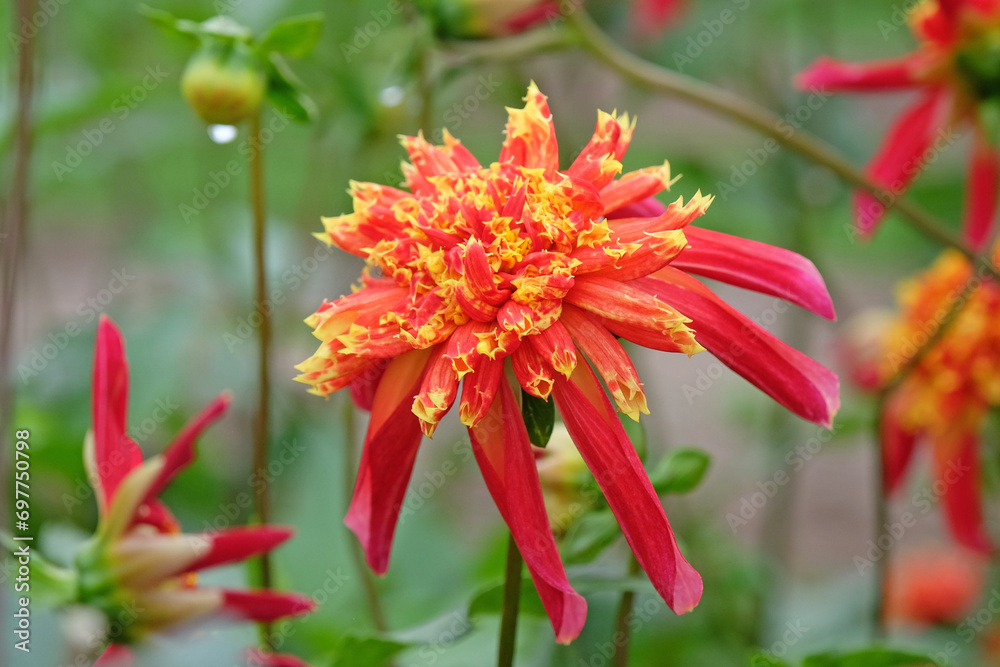 Red and yellow star anemone Dahlia Octopus Sparkle in flower