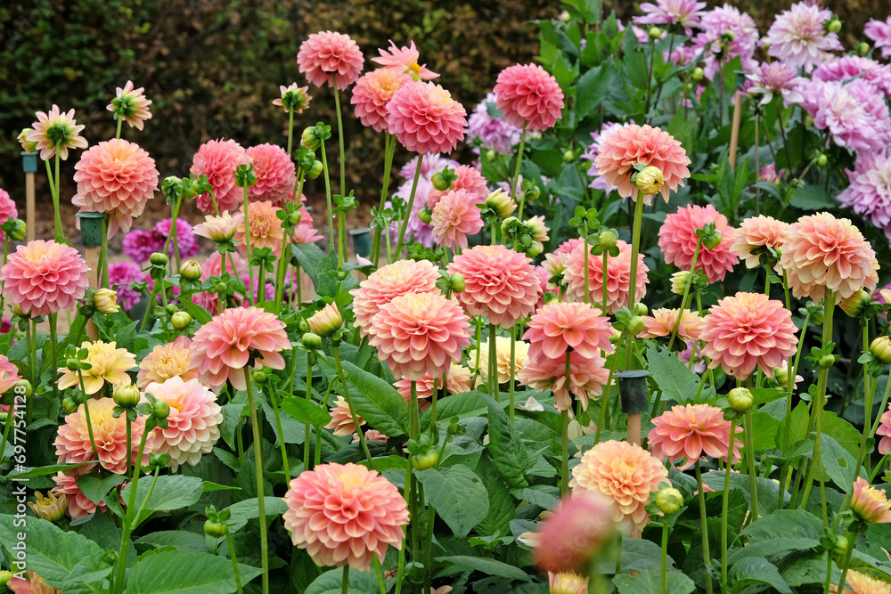 Pink, apricot and gold waterlily dahlia 'Milena Fleur' in flower.