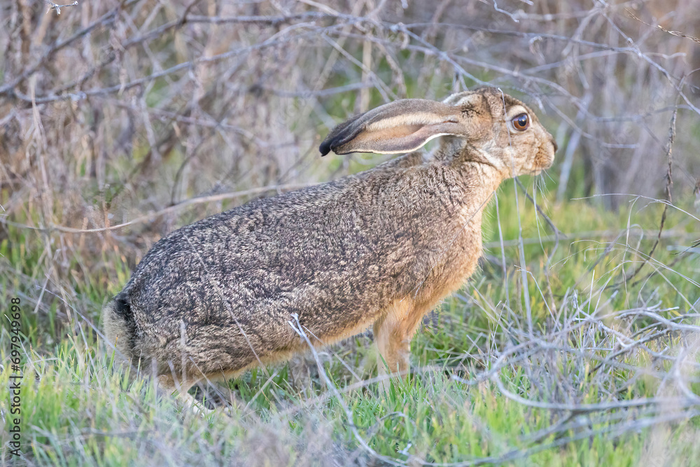 Black-tailed jackrabbit flattening its ears and crouching, both are indications of being scared and an attempt to hide.
