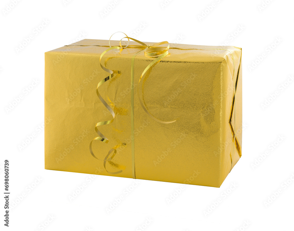 Gift box wrapped in gold paper isolated on white