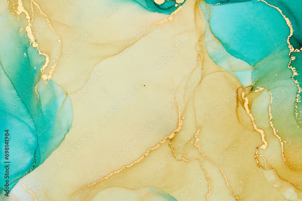Natural luxury abstract fluid art painting in alcohol ink technique. Tender and dreamy wallpaper. Mixture of colors creating transparent waves and golden swirls. For posters, other printed materials
