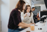 Young team in a modern office collaborating, brainstorming, and discussing statistics. Pleasant atmosphere fosters creative thinking and teamwork for business success.