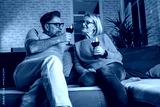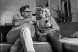 Cheers. Beautiful lovely senior couple sitting at home, drinking red wine, holding glasses during romantic evening. Smiling mature grey bearded man embracing his happy woman