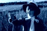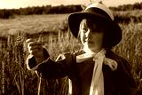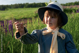 Portrait of a little girl in a dress with a bow with a straw hat on her head walking through a meadow with lupines.