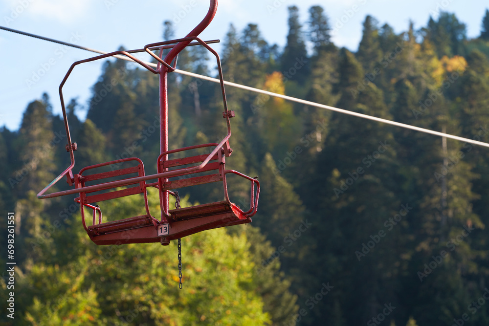 Two-seat cable car chair number 13 in the air on a cable against a backdrop of forested mountains.