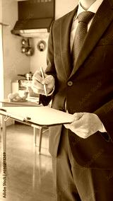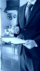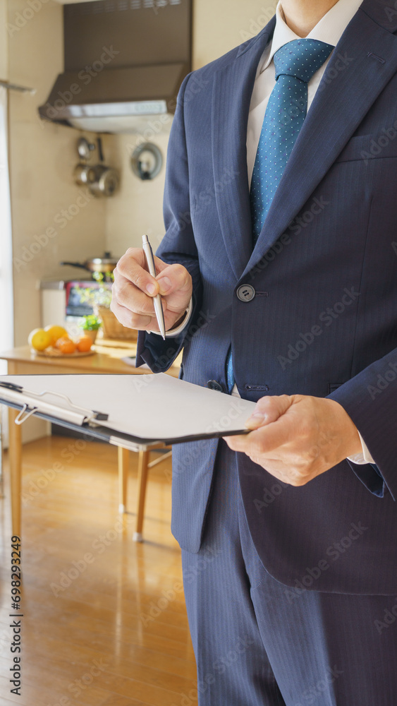 キッチン・ダイニングを点検するビジネスマン|リフォーム調査・見積り イメージ