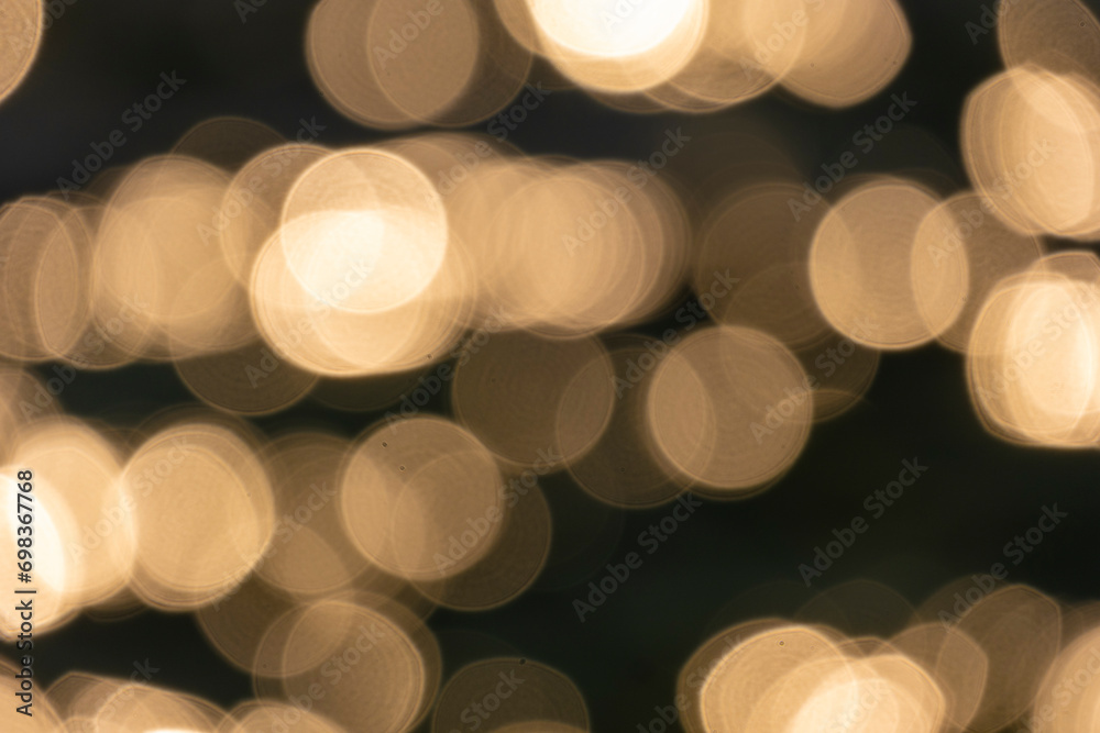 Night Bokeh lighting background, defocused blurred shimmering coloured lights, copy space. Festive Christmas glowing. Celebration - special event concept. Luxurious texture effect photography.