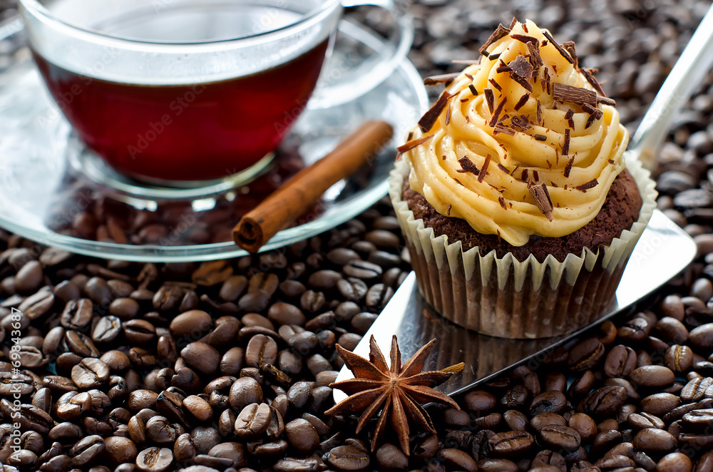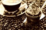 A cup of coffee and a cupcake coffee beans