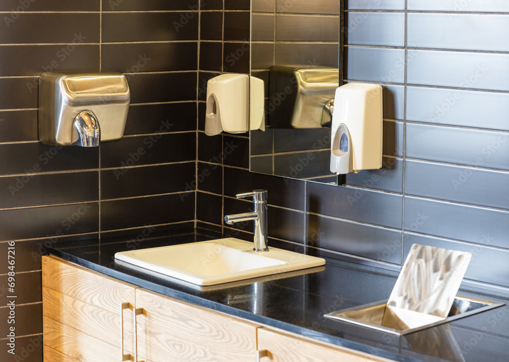 designer washing sink with hand dryer and soap dispenser in a commercial area