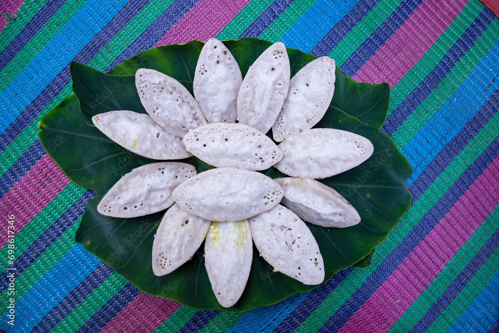 Bangladeshi Traditional Aush or Porangi Rice Special Delicious hand-made Chitoi Pitha Decorated on the green leaf Recipe