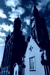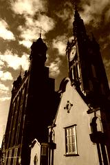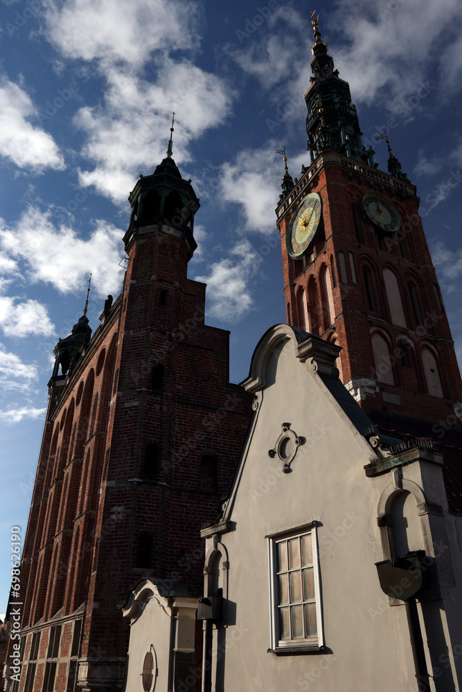 Gothic and renaissance art in Gdansk, Poland. Main Old Town city hall tower sky-scraping over old buildings