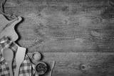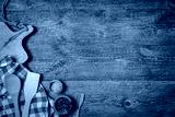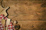 Old wooden kitchen utensils or cooking tools and bowls on wooden background, top view, flat lay. Kitchenware collection with copy space. Cooking background.
