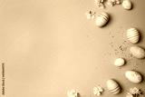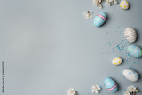 Happy Easter composition for easter design. Elegant Easter eggs and flowers on pastel blue background. Flat lay, top view, copy space.