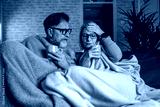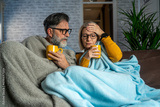 Dissatisfied senior couple having problem with central heating, sitting on sofa at home, freezing, drinking hot tea trying to warm up. Sick man and woman wrapped in blankets suffering from cold or flu