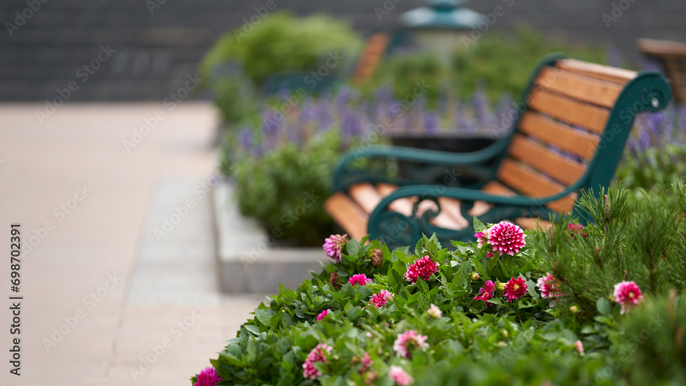 Wooden bench surrounded by picturesque flowerbeds. A fragment of the infrastructure of the urban environment.